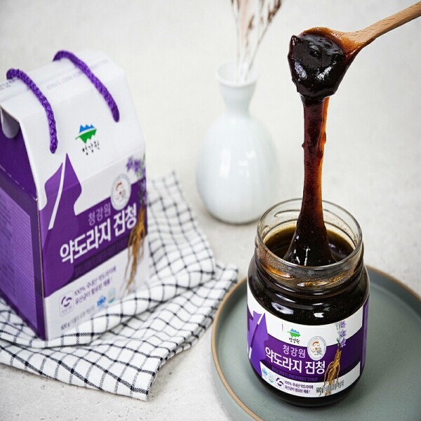 도라지 과육알갱이가 씹히는 달콤쌉사름한 약도라지진청입니다.